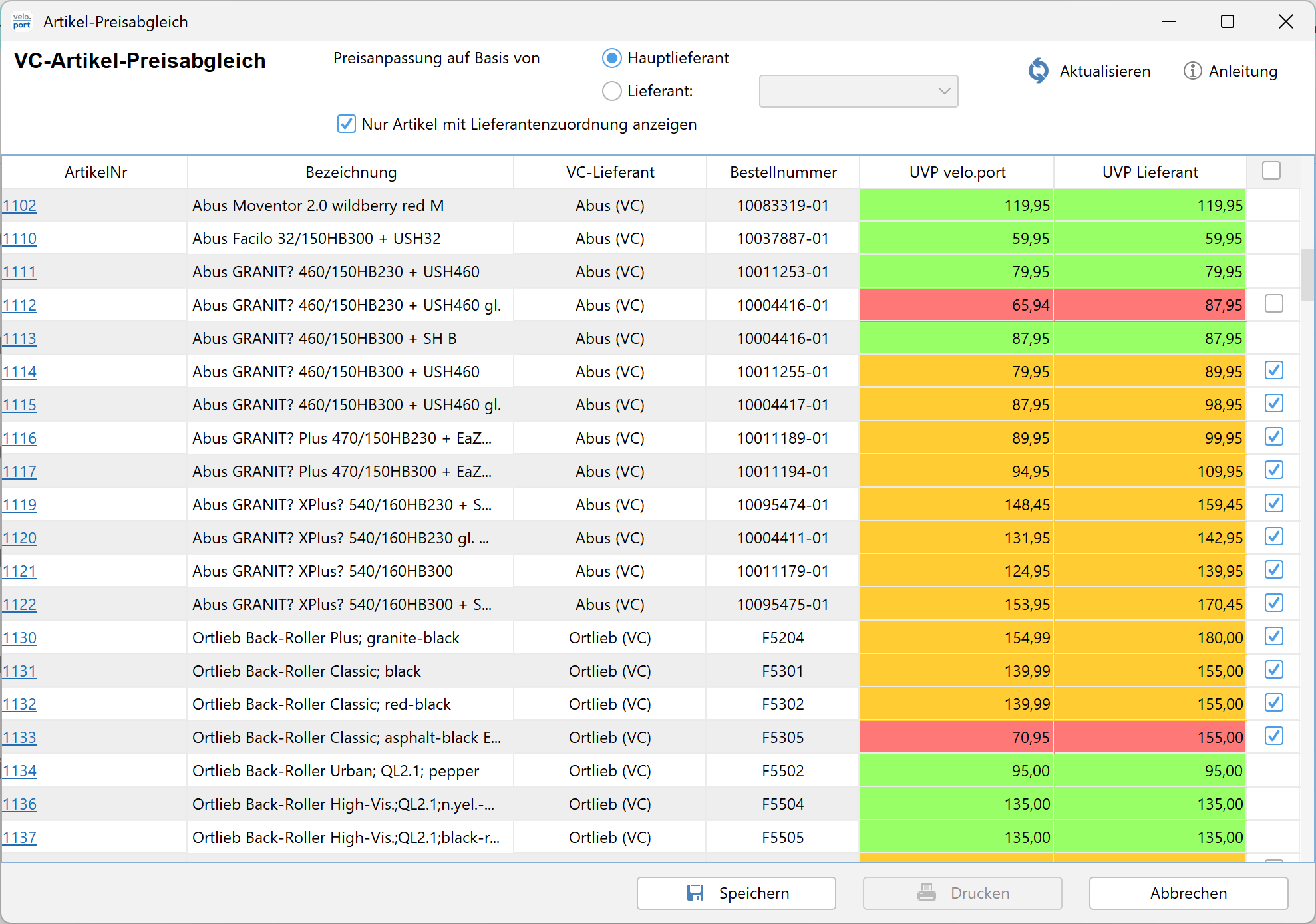 Gelb = Der Artikelpreis laut velo.port ist höher als der Lieferanten-UVP.