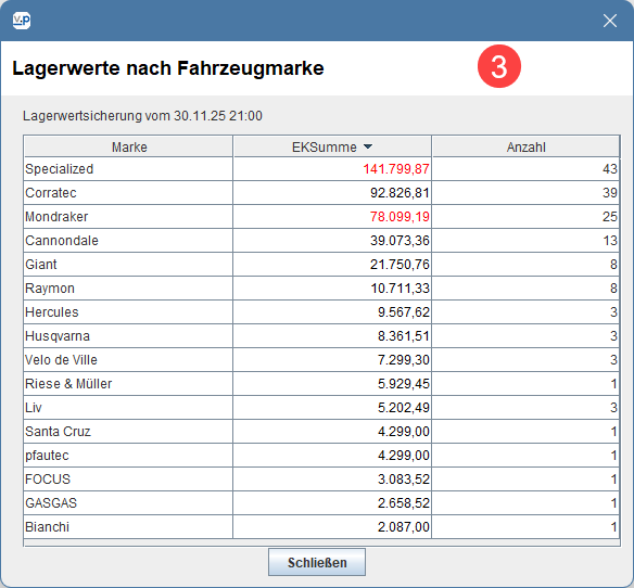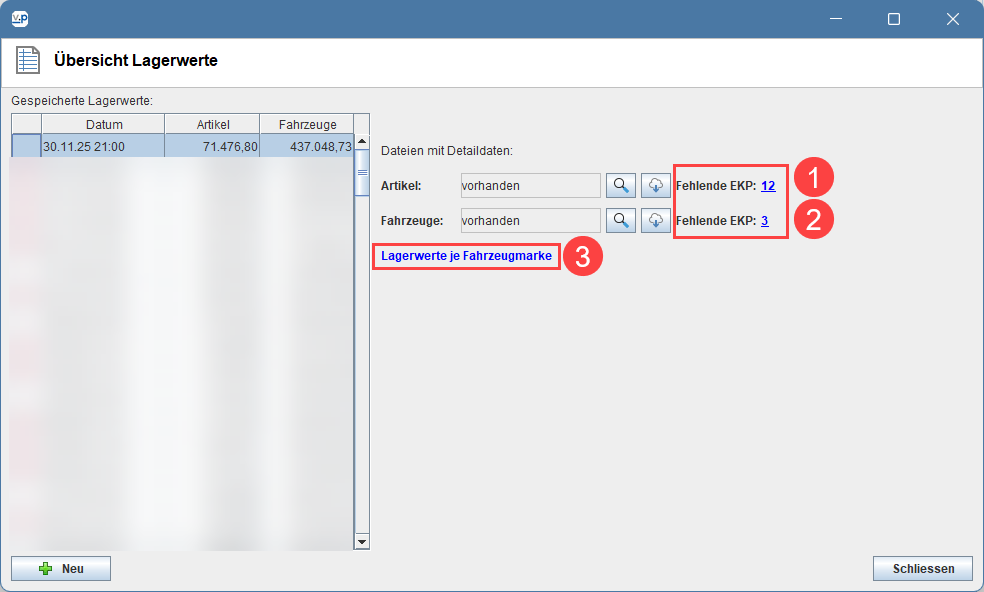 Zu jedem Lagerwertsicherungspunkt kannst du dir nun die genaue Liste der Artikel und Fahrzeuge mit fehlendem EKP auflisten und dir eine Aufstellung der Lagerbestände je Fahrzeugmarke anzeigen lassen: