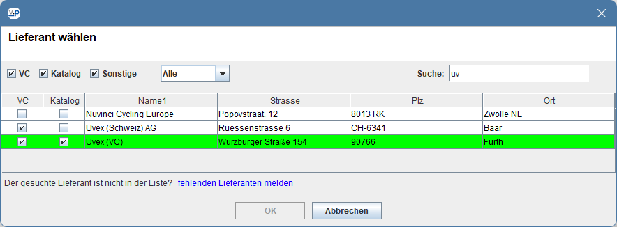 Bislang haben wir bereits hinzugefügte Lieferanten nicht mehr in der Suchergebnisliste angezeigt. Da dies gelegentlich zu Verwirrung führte, belassen wir die bereits angelegten Lieferanten in der Suchergebnisliste und markieren sie grün:
