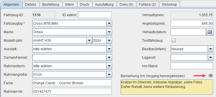 In der Fahrzeugverwaltung kannst du nun mit dem Klick auf das Auge-Symbol die Bemerkung hervorheben: