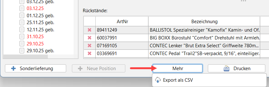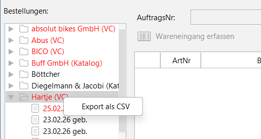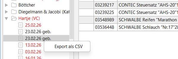 - Und ein Rechtsklick auf die gebuchte Bestellung exportiert wie bisher nur den einzelnen Wareneingang: