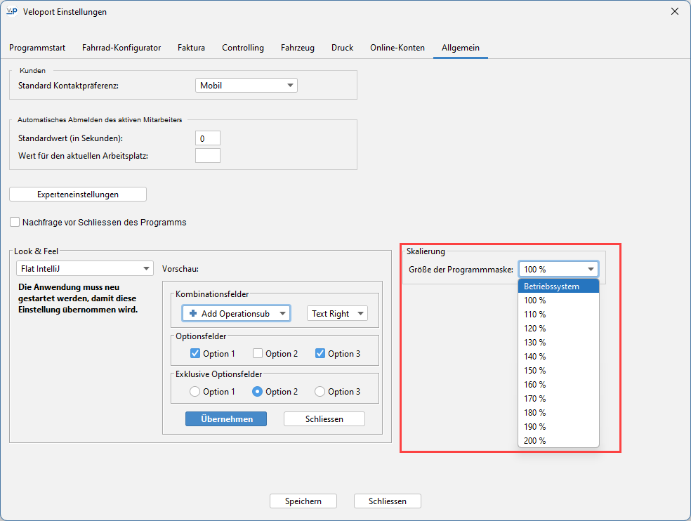 In der Java 21 Variante von velo.port (siehe auch: velo.port installieren) kannst du nun unter Extras>>Einstellungen>>Allgemein eine vom Betriebssystem abweichende Skalierung für die Benutzeroberfläche einstellen.