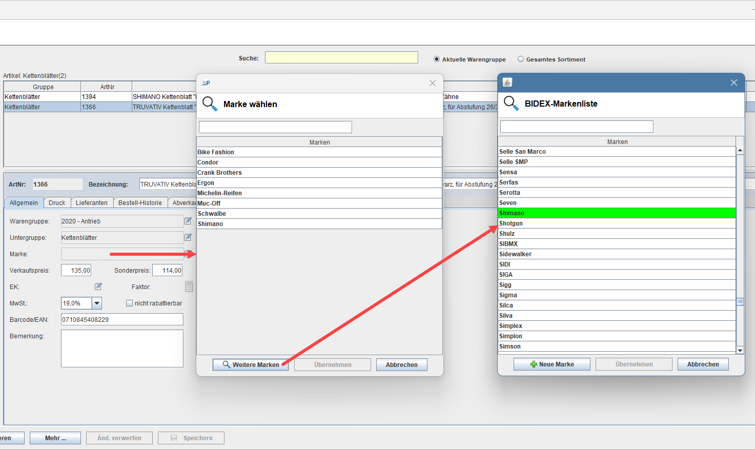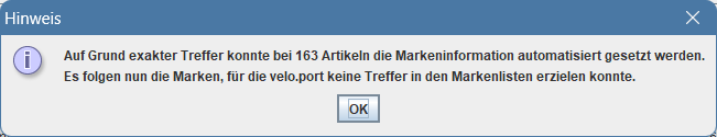 Bei jeder Artikelneuanlage wird versucht, anhand der Markeninformation aus den Veloconnect-Daten eine passende Marke zuzuordnen. Gegebenenfalls erfolgt dazu eine Nachfrage.