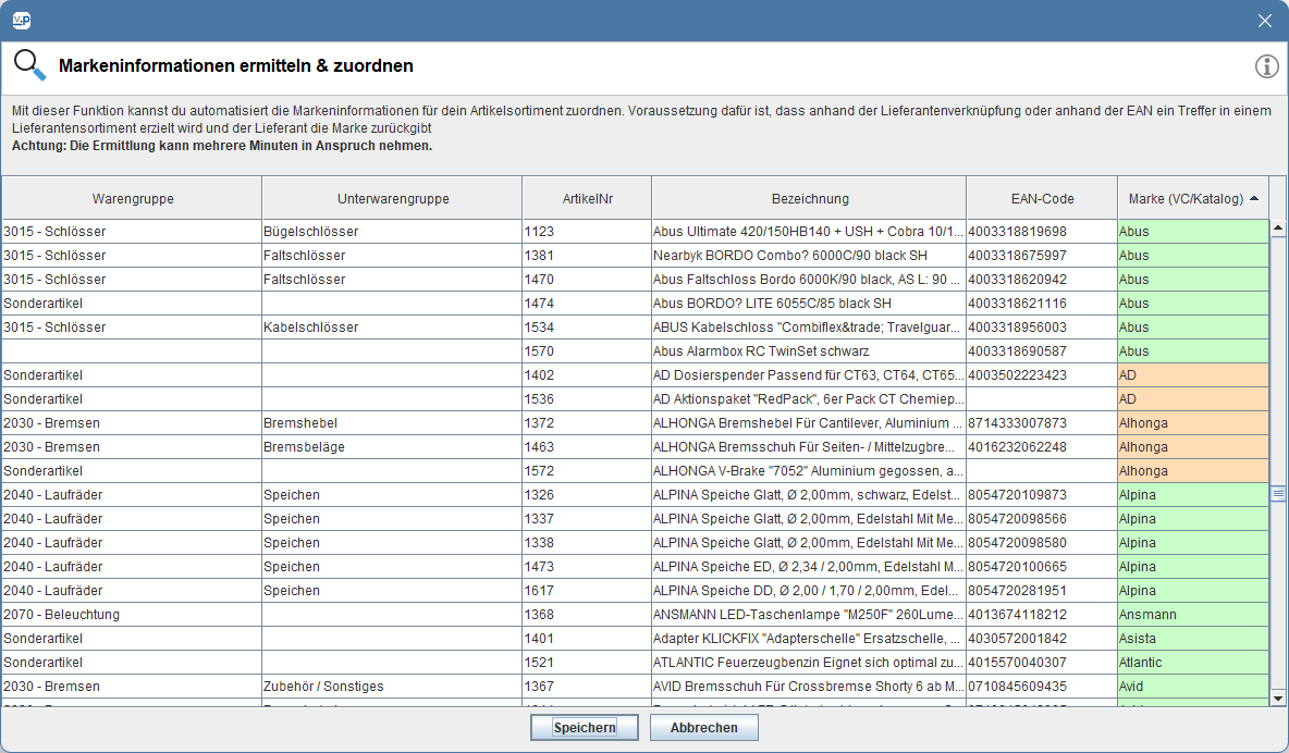 • rot = Es wurden keine Markeninfos gefunden. Bei solchen Artikeln musst du einzeln über die Artikelverwaltung eine Marke zuordnen, falls gewünscht.