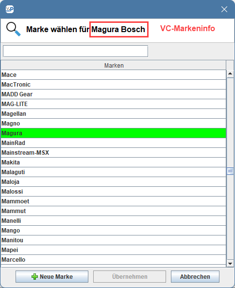 Im obigen Beispielfall würdest du auf die bereits in deinem Markenstamm befindliche Marke "Magura" doppelklicken.