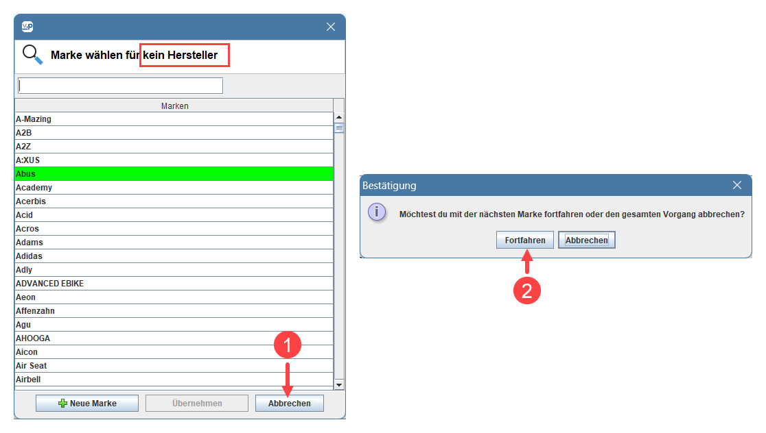 Für alle VC-Markeninfos, mit denen kein eindeutiger Treffer in den Markenlisten erzielt werden konnte ( = Kennzeichnung orange), wirst du jetzt einzeln um eine Zuordnung gebeten: