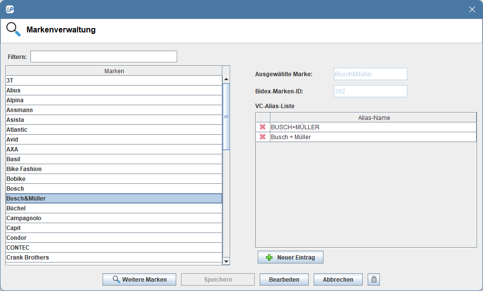 Wähle vorzugsweise Marken aus der Bidex-Liste aus (Doppelklick). Falls du nicht fündig wirst, kann die Marke über Neue Marke manuell angelegt werden.