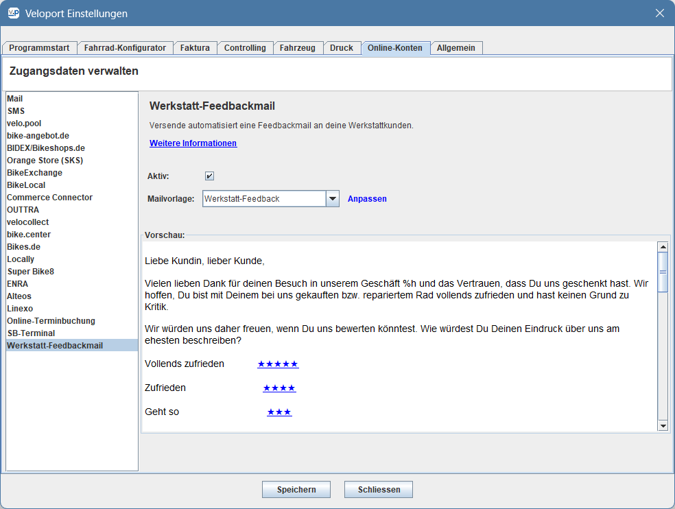 Ist die Werkstattfeedbackmail aktiv, prüft das System jeden Abend um 19:45 Uhr, welche Werkstattaufträge an diesem Tag abgeholt wurden. Der Versand erfolgt serverseitig, sodass velo.port nicht laufen muss.