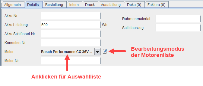 In der Fahrzeugverwaltung selektierst du ein Fahrzeug und klickst für eine Motorzuordnung oder -neuanlage auf das unten markierte Feld (Auswahlliste):