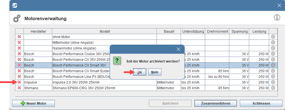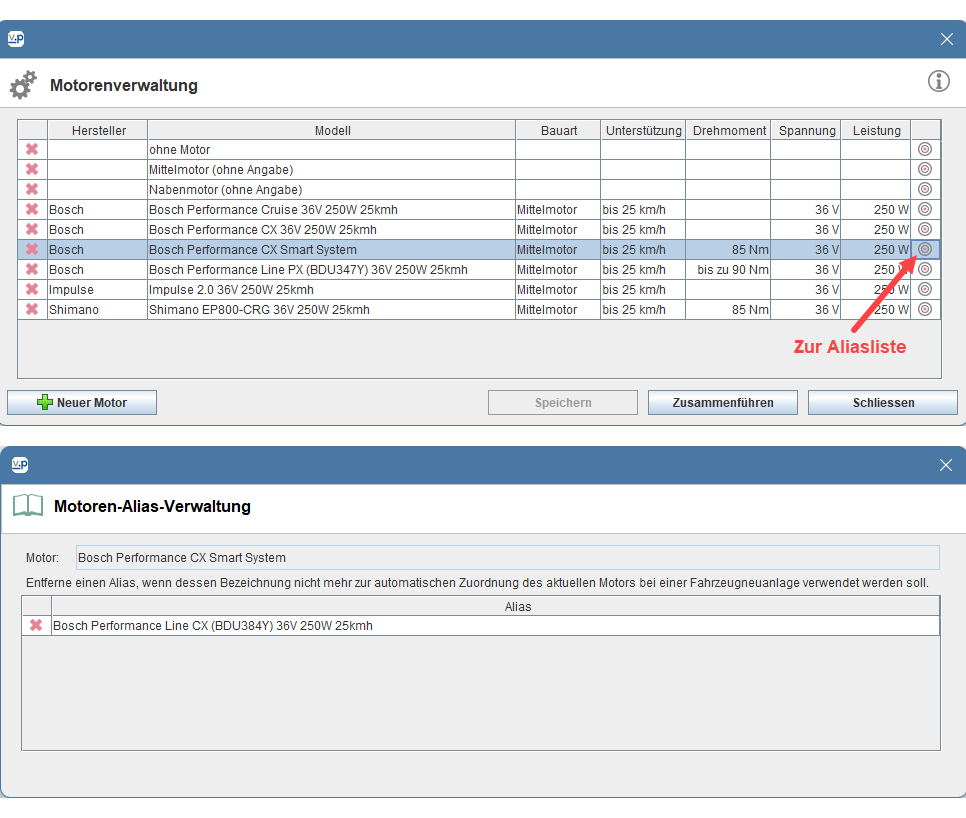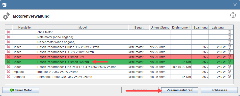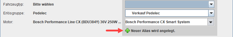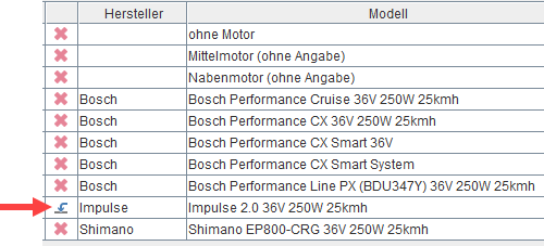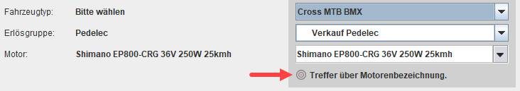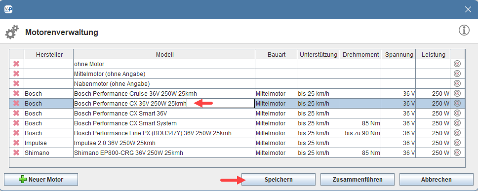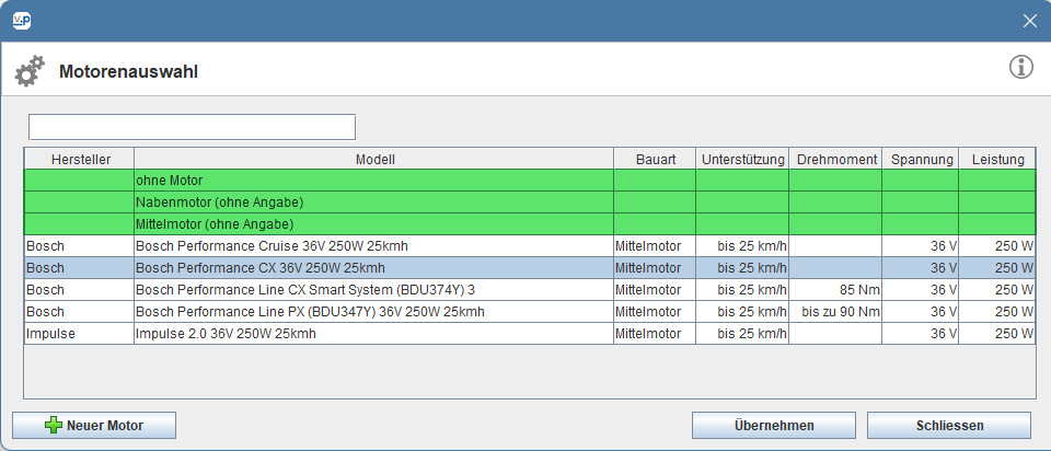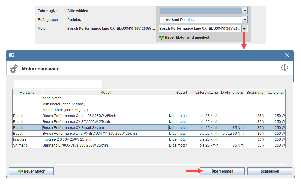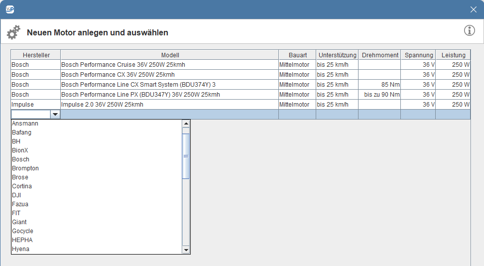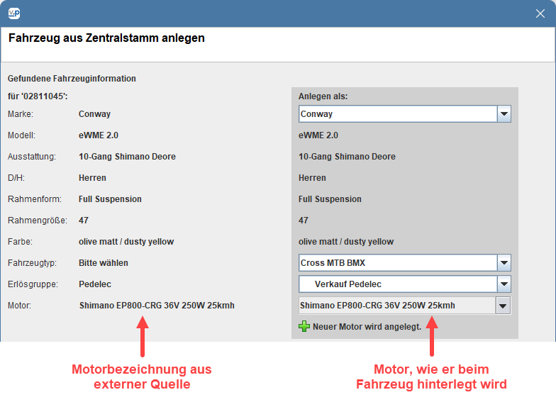 Bei der Anlage wird velo.port versuchen, einen passenden bereits angelegten Motor zu finden.