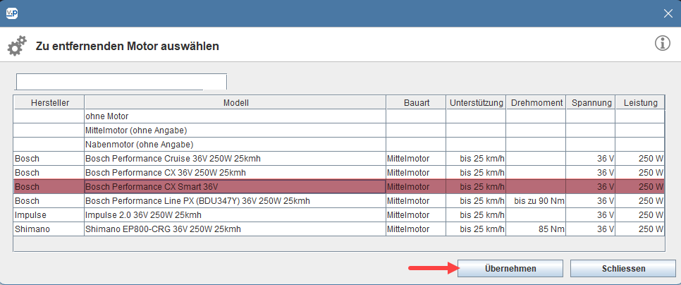 Per Doppelklick auf einen Eintrag oder Auswahl + Schaltfläche Übernehmen kannst du einen bestehenden Motor für das selektierte Fahrzeug setzen.